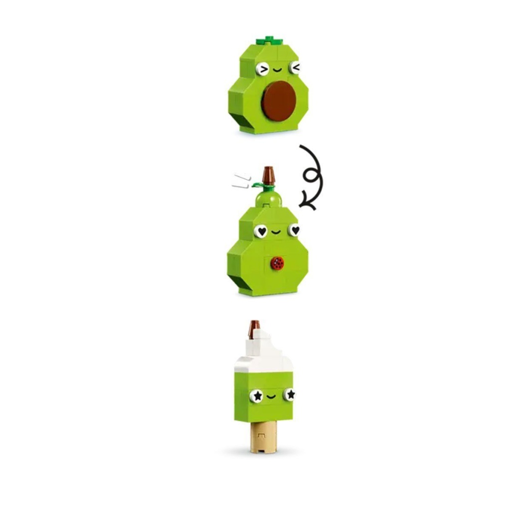 Çocuklar, renkli ve büyüleyici yapım parçalarıyla gözler, ağızlar ve çeşitli dekoratif parçalar gibi özel parçaları kullanarak 4 sevimli Yiyecek Arkadaş oyuncağı yapabilir: kapkek, dondurma, avokado ve taco. Çocuklar yapım parçalarını karıştırarak modelleri süslü pasta, inci çayı, armut ve paniniye dönüştürürken yaratıcı eğlence devam eder. Çocuklar yapım becerilerine daha fazla güvendikçe, sezgisel yapım rehberine bakarak yüz ifadelerini, şekilleri veya renkleri değiştirip yeşil dondurma, meyve suyu kutusu, karpuz dilimi, çikolata ve kocaman sandviç gibi yeni Yiyecek Arkadaşlar oluşturabilir.