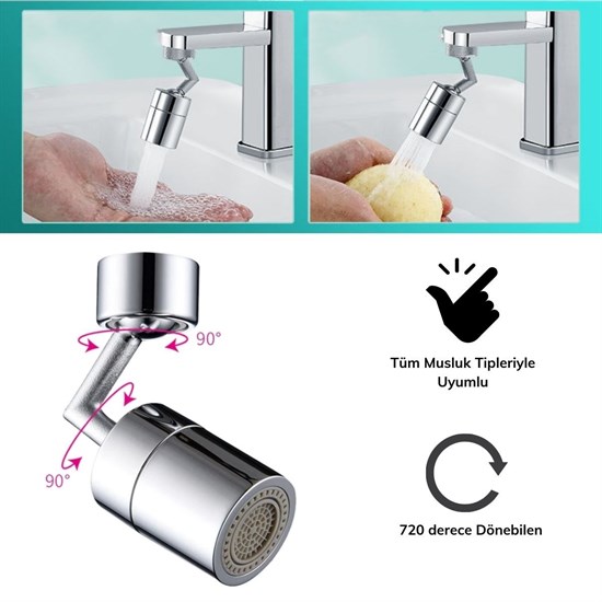 720 Derece Dönebilen Musluk Başlığı sayesinde artık kovalara su doldurmak, yüzünüzü ve ağzınızı, kollarınız ıslanmadan pratik bir şekilde yıkamak çok kolay. Pratik bir şekilde monte etmenizi sağlayacak 720 Derece Dönebilen Tüm Musluk Tipleri İle Uyumlu Musluk Başlığı'nın içerisinden çıkan monte aparatları işinizi çok kolaylaştıracaktır. Tüm musluk tipleri ile uyumludur.