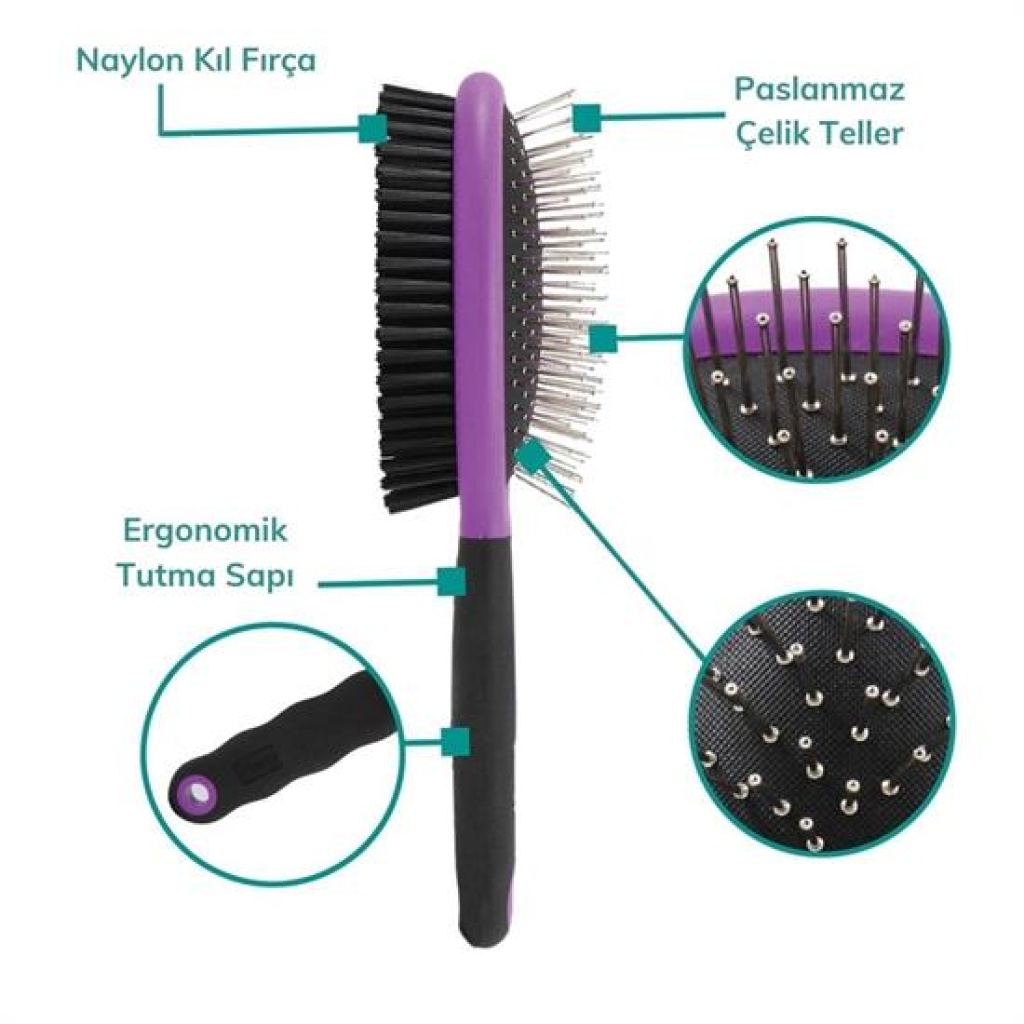 Pet fırçasının kullanabileceğiniz iki tarafı bulunur. İster dişli tarafı ile detaylı br şekilde tarayın, isterseniz de fırça tarafı ile yalnızca üstünden geçin. Bakımına tamamen siz karar verin.