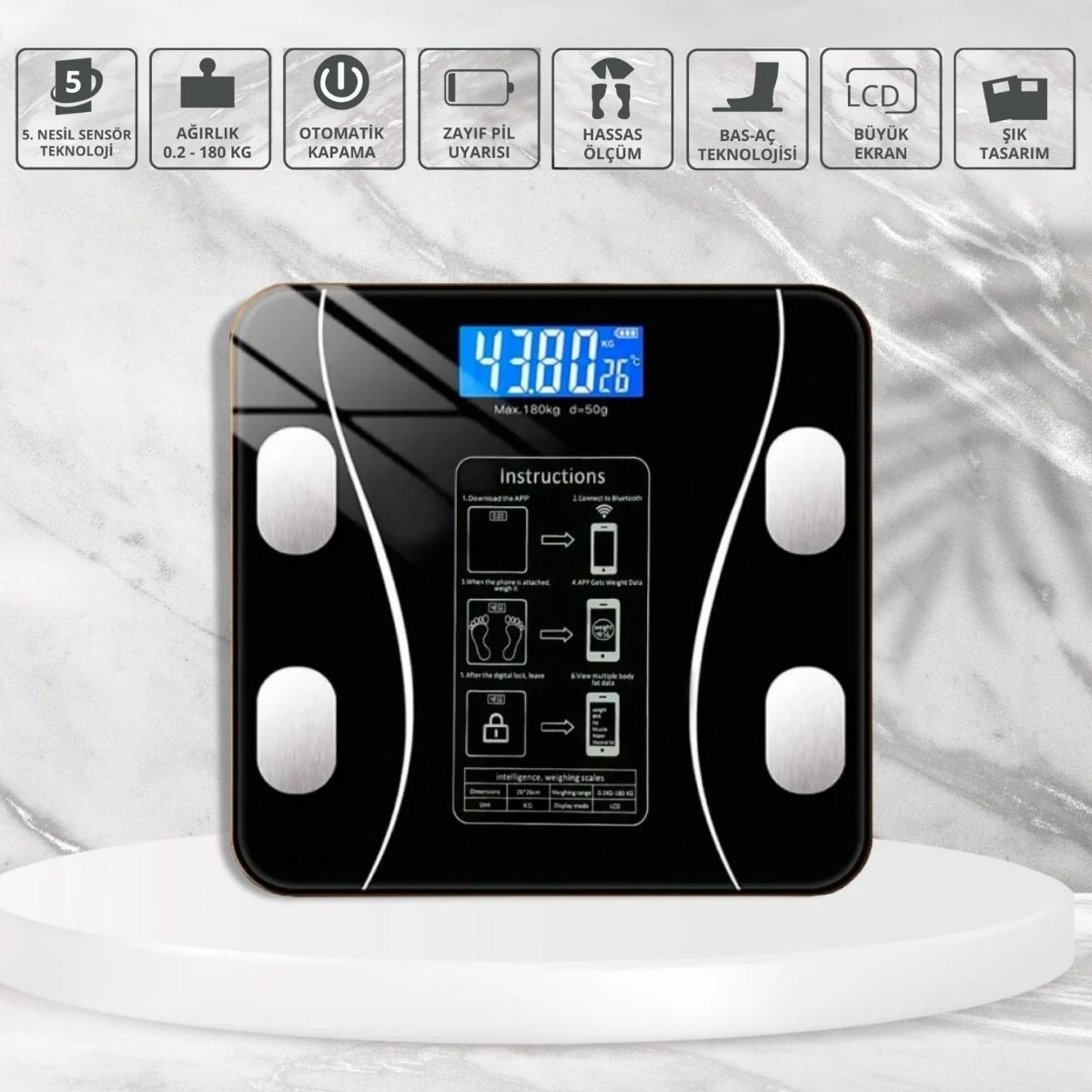 Dijital Baskül Yağ Ölçer Fonksiyonlu Akıllı Baskül – Bluetooth Bağlantılı Tartı