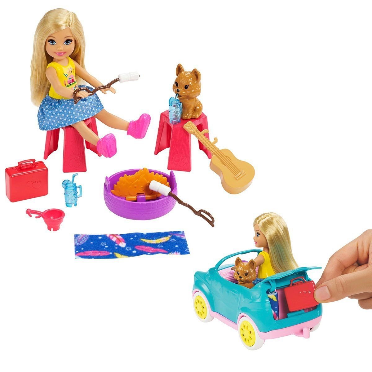 Chelsea™ bebek ve köpeği, evin arka bahçesi dahil her yerde kamp yapmaya hazır. Çünkü özel araçları Club Chelsea™ Karavan onların her zaman yanında! Karavan arabadan ayrılıp oyun setine dönüşüyor ve adeta evden uzakta yeni bir ev yaratıyor. Seyahat etmek için karavanı üstü açılır arabaya bağla, kamp vakti geldiğinde karavanı ayır. Daha sonra karavanı açarak lavabolu mutfağı, ocağı, açılan kapılı buzdolabını, merdivenli ranzayı ortaya çıkar. Bu ranza sayesinde arkadaşın geldiğinde kalacak yeri olacak. Köpeğin girip çıkabilmesi için ufak bir köpek kapısı bile var. 10'u aşkın oyuncakla hayal gücünü canlandırıp kamp şarkıları söyle ve hikayeler anlat. Klasik kamp anlarını yaşayabilmen için kamp ateşi, gitar, iki tabure ve marşmelovlu iki çubuk ve bunların yanında iki içecek, bir tencere, bir havlu ve bir bavul bulunuyor. Yola çıkma vakti geldiğinde her şeyi topla. Arabanın bagajı da dahil, yola çıkarken eşyalarını koyabileceğin birçok yer var. Chelsea oyuncak bebek, üzerinde "happy camper" (mutlu kampçı) yazan sarı tişörtü, beyaz benekli kumaştan mavi eteği ve pembe ayakkabılarıyla dünyayı keşfetmeye hazır. Yavru köpeğinin de suratında mutluluktan uçtuğunu gösteren sevimli bir ifade var. Çocuklar bu oyun setiyle dünyayı keşfetmeye bayılacak. Eğlenceli birçok farklı oyun için diğer Club Chelsea™ bebek ve aksesuarlarını topla (her biri ayrı olarak satılır ve stoklar sınırlıdır). Etek ve ayakkabı giyen Chelsea™ bebek, yavru köpek, araba, karavan, gitar, kamp ateşi, iki tabure, marşmelovlu iki çubuk, iki içecek, bir tencere, bir havlu, bir battaniye ve bir bavul dahildir. Renkler ve süslemeler çeşitlilik gösterebilir.