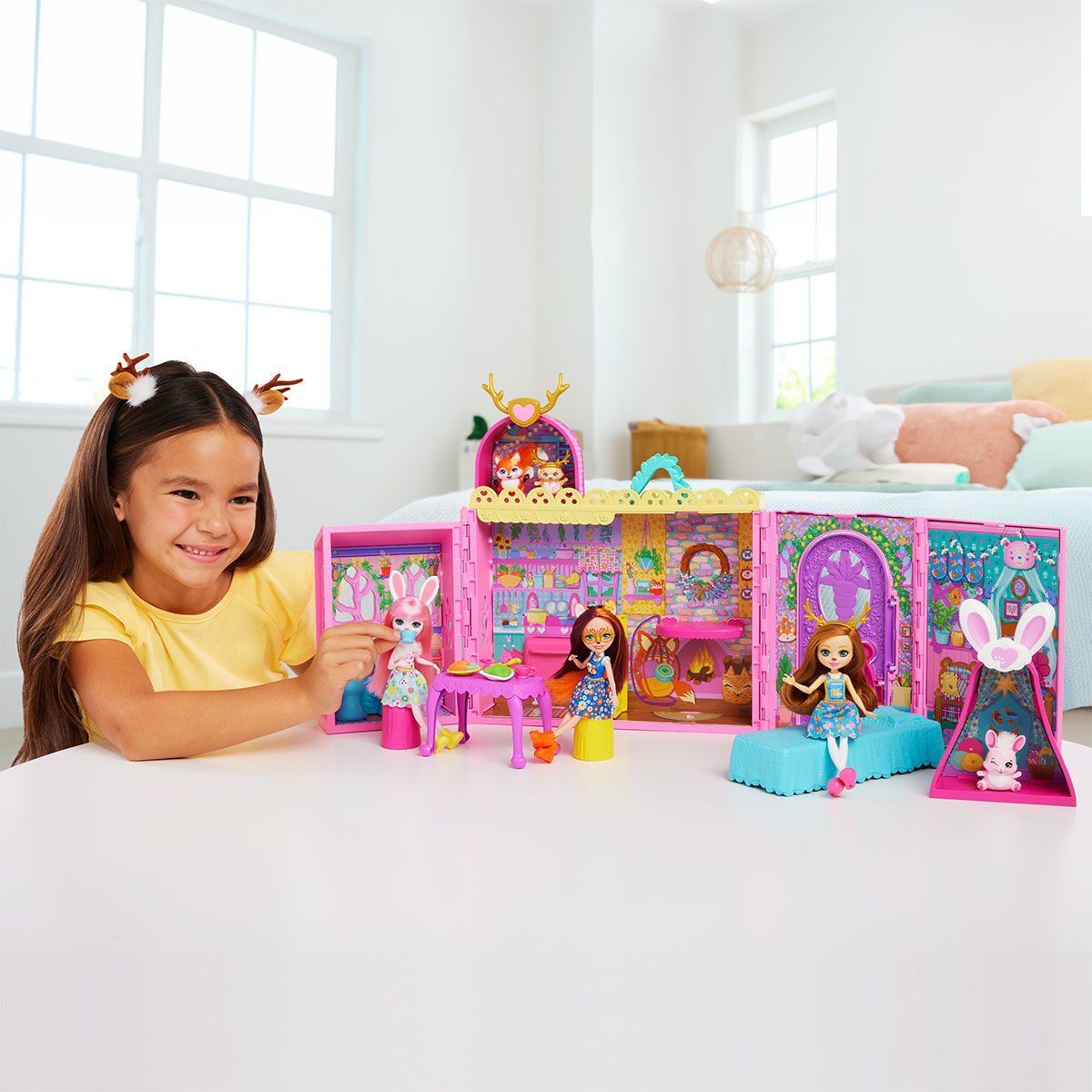 Enchantimals Dostların Eğlenceli Evi'nin kapısı herkese açık! Bu dönüşebilen oyun setinin parçalarını dilediğiniz gibi karıştırıp eşleştirerek hem bebeklerle hem de hayvan dostlarla oynadığınız oyunları kişiselleştirin. Ev açıldığında mutfak, banyo, yatak odası ve çatı havuzu dahil yedi oyun alanı ortaya çıkar. Çocuklar; 24 aksesuar, bebekler ve hayvan dostlarla evin içinde sayısız hikaye canlandırabilir. Çocuklar bebeği ve hayvan dostunu kişiselleştirip daha eğlenceli bir görünüm için evi dört farklı hayvan kulağıyla süsleyebilir. Burada her şey mümkün! Özellikle arkadaşlarıyla evcilik oynamayı seven dört yaş ve üzeri çocuklar için idealdir. Renkler ve süslemeler çeşitlilik gösterebilir.