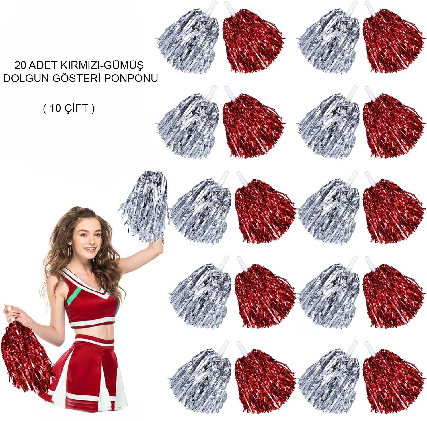 Kırmızı Beyaz Metalik Dolgun Gösteri Ponponu 20 Adet (10 Çift) (5343)