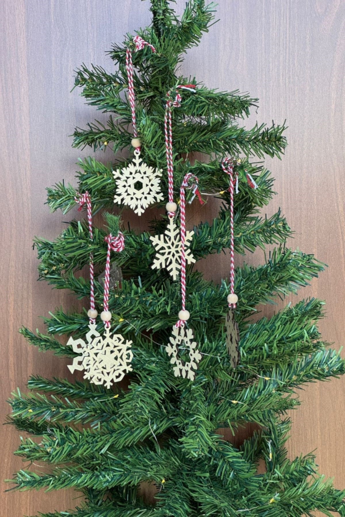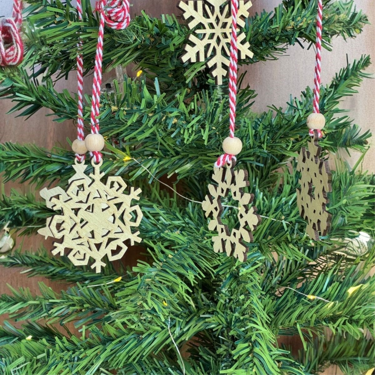 Yeni yılın büyüleyici atmosferini evinize taşıyan 6 Parça Kırmızı Beyaz İpli Kar Tanesi Model Ahşap Yılbaşı Ağaç Süsü, doğal ahşap dokusu ve zarif tasarımıyla yılbaşı dekorasyonunuzun vazgeçilmezi olacak.