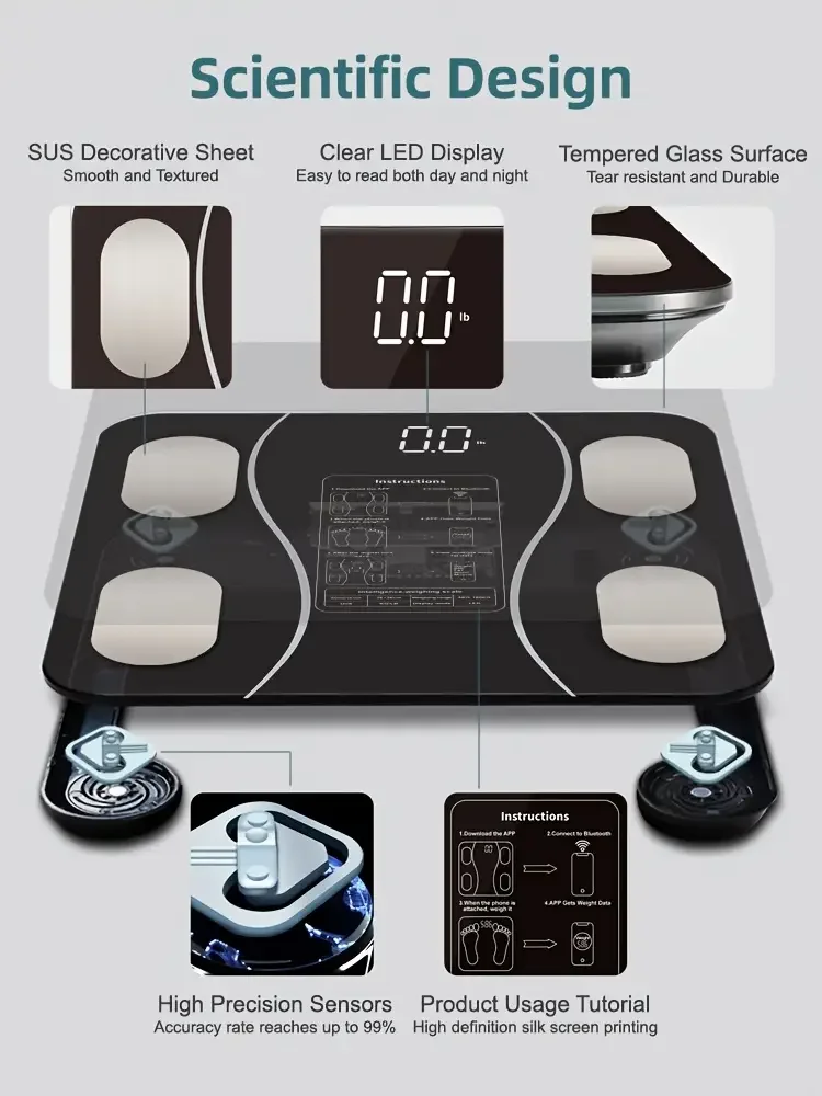 Kablosuz Vücut Tartısı, Yüksek Hassasiyetli Banyo Terazisi, Uygulama Bağlantılı LCD Ekran, kg/lbs/t Birim Değiştirme - Ev/Spor Salonu/Banyo İçin (Pil Dahil Değildir)
