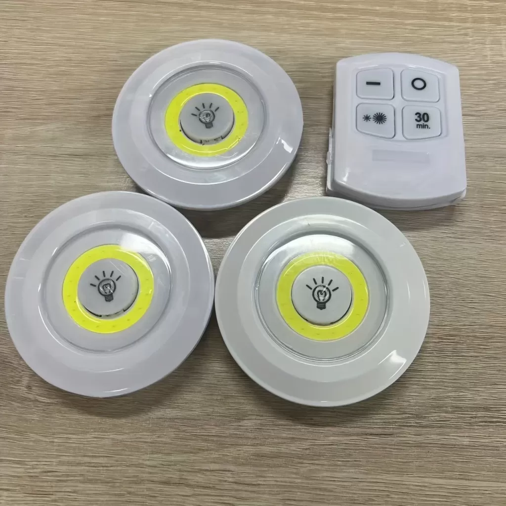 3’lü Kablosuz LED Spot Işık Seti – Uzaktan Kumandalı, Yapışkan Bantlı, Pilli, 3W COB LED, 150 Lümen, 2 Parlaklık Seviyesi, Zamanlayıcılı Dolap Tezgah Banyo Aydınlatma