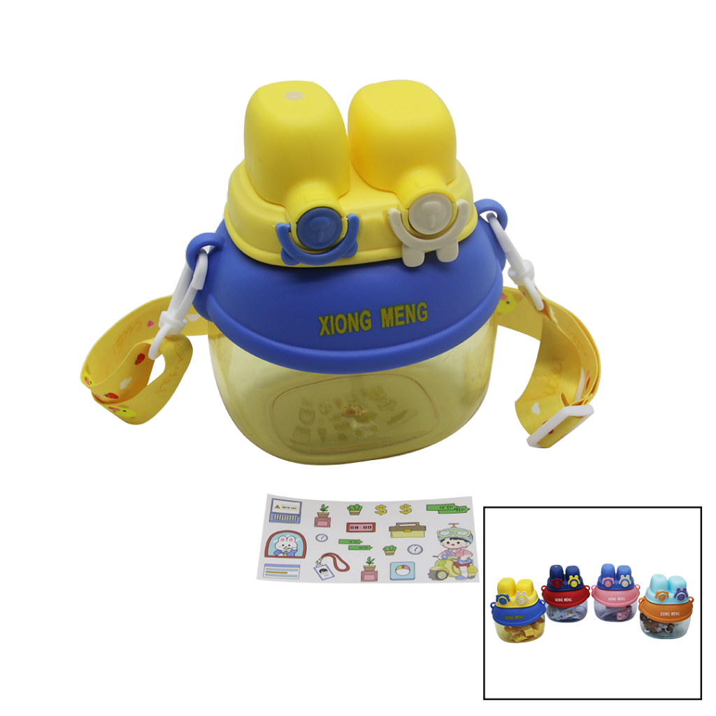 YÜZ MODELİ - 2 KİLİTLİ KAPAK RENKLİ MİKA KRİSTAL SULUK MATARA PİPETLİ - NAYLON ÇANTALI - ASKILI 1280ML (5343)